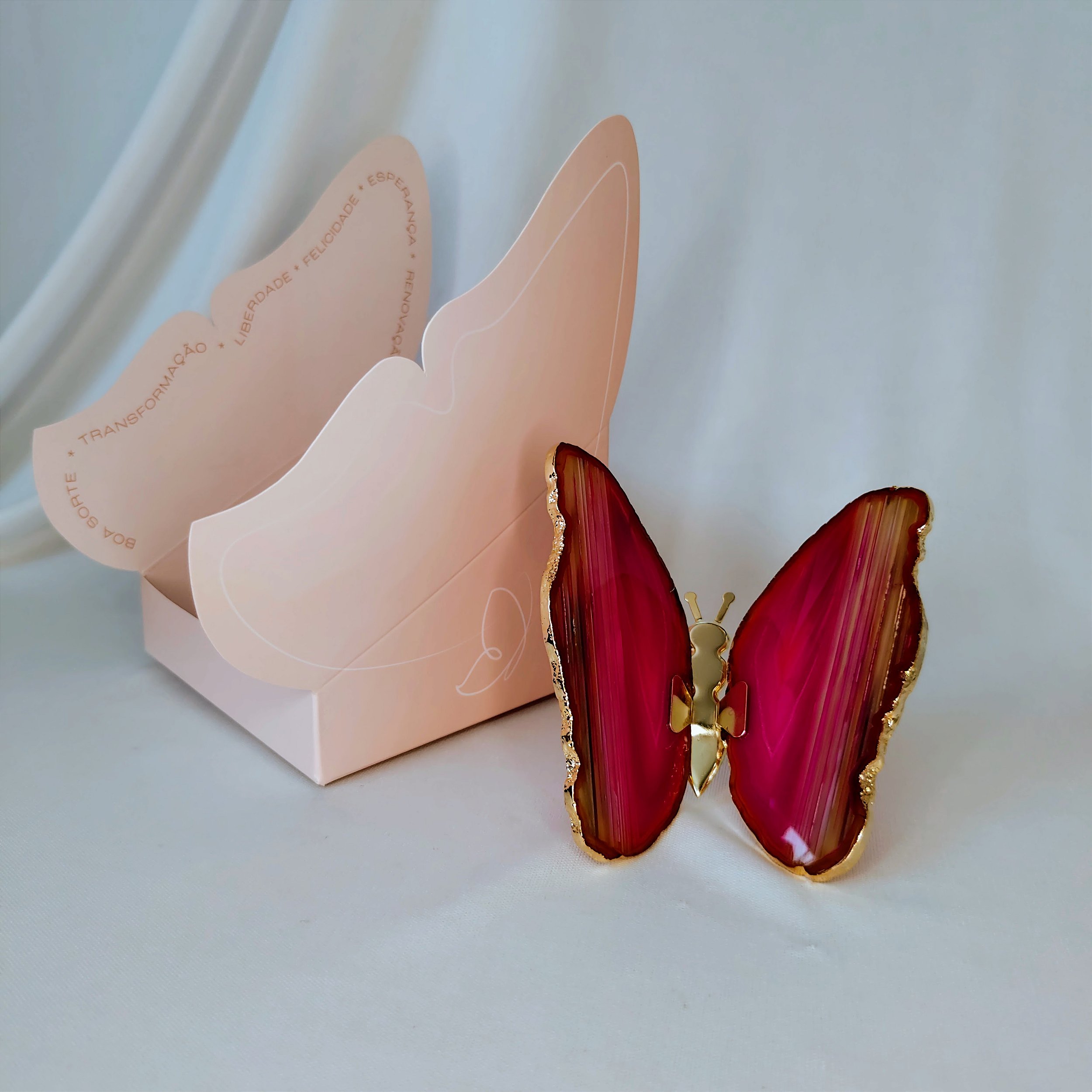 Borboleta Ágata Pink – Borda Dourada – cristal decorativo da Coleção Asas. Esta peça apresenta asas em ágata pink com tonalidades naturais e um acabamento com borda dourada que confere um toque de brilho e sofisticação ao design. A ágata é uma variedade de quartzo valorizada por sua durabilidade e beleza natural, sendo ideal para exibição em prateleiras, mesas ou aparadores, enriquecendo a decoração de ambientes com um visual elegante e artístico. O polimento da pedra realça suas nuances únicas e o contraste entre o tom rosa e o detalhe dourado adiciona charme à peça.