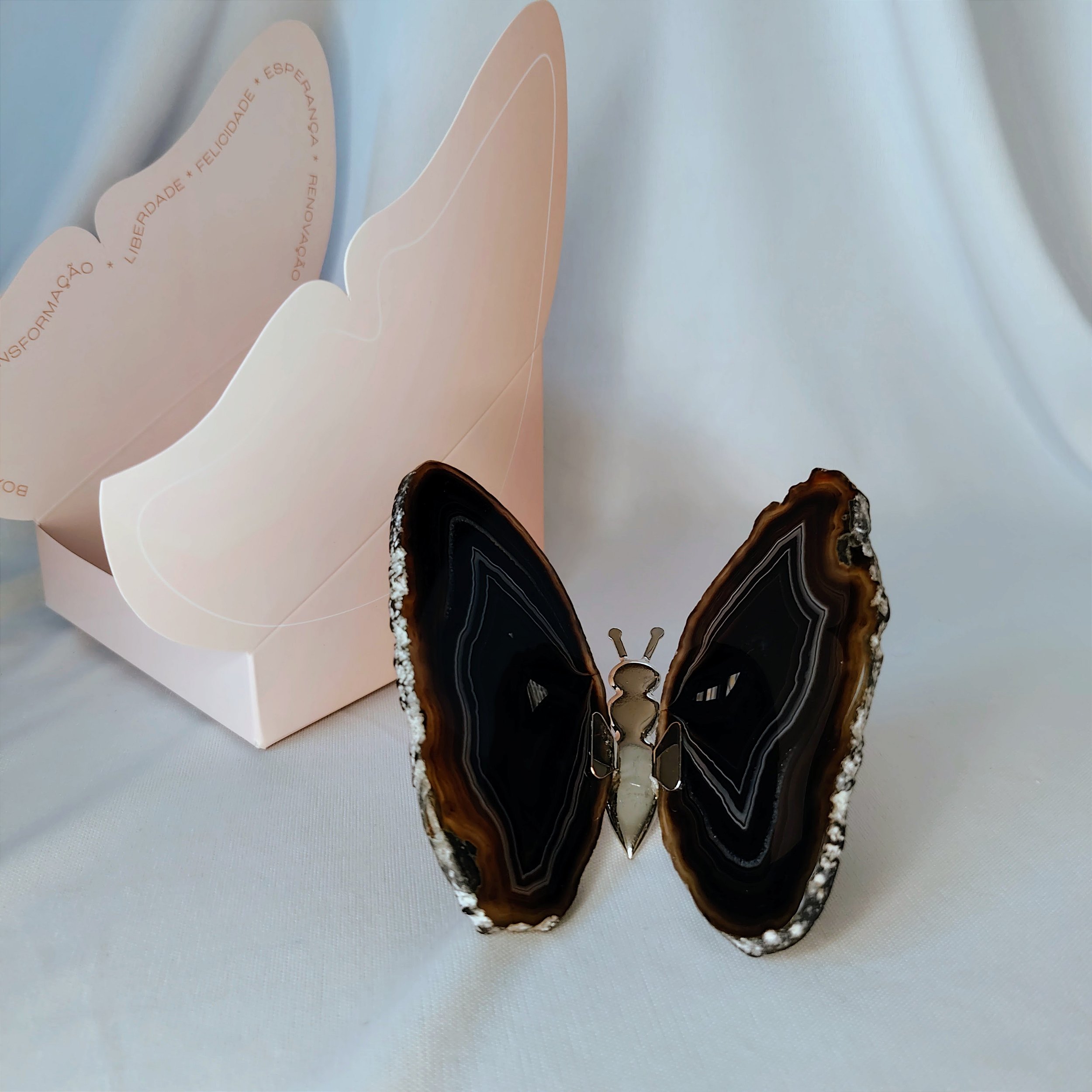 Borboleta Ágata Preta – Prata – cristal decorativo da Coleção Asas. Esta peça apresenta asas em ágata preta com tonalidades naturais e um acabamento polido que realça o visual marcante e sofisticado da pedra. A ágata é uma variedade de quartzo reconhecida por sua durabilidade e beleza natural, sendo ideal para ser exibida em prateleiras, mesas ou aparadores e enriquecer a decoração de ambientes com um toque elegante. Cada exemplar possui características únicas em cor e padrão devido às variações da pedra natural.