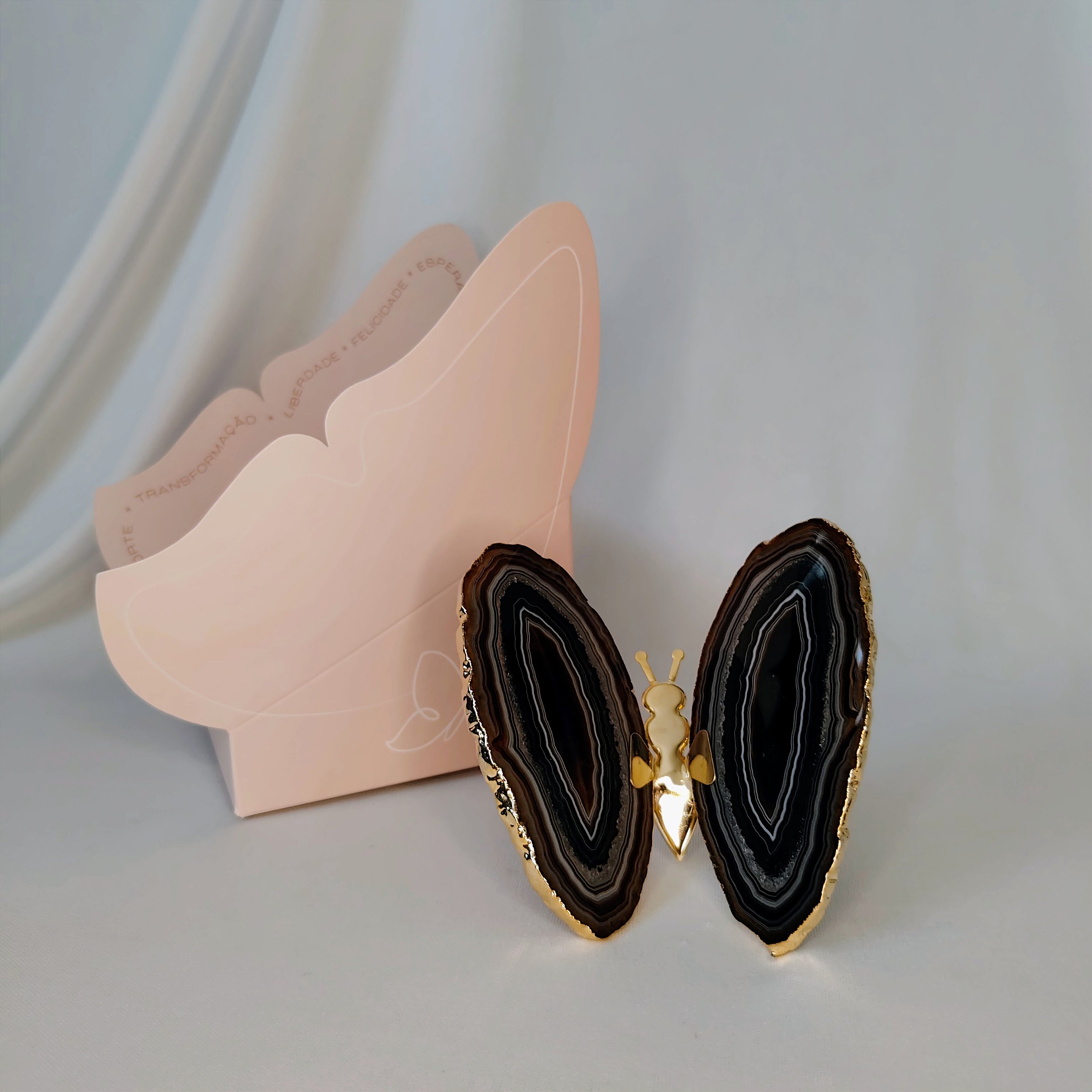 Borboleta Ágata Preta – cristal decorativo da Coleção Asas. Esta peça apresenta asas em ágata preta com tonalidades naturais e acabamento polido que realça a textura orgânica e profunda da pedra. A ágata é uma variedade de quartzo valorizada por sua durabilidade e beleza natural, ideal para ser exibida em prateleiras, mesas ou aparadores, enriquecendo a decoração com um visual sofisticado e orgânico. Cada exemplar possui características únicas devido às variações naturais da pedra.
