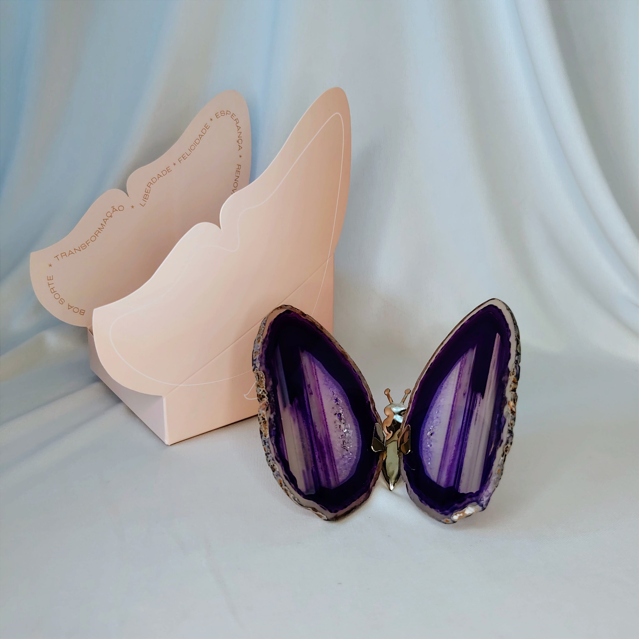 Borboleta Ágata Roxa – cristal decorativo da Coleção Asas. Esta peça apresenta asas em ágata roxa com tonalidades naturais e um acabamento polido que realça o visual orgânico e elegante da pedra. A ágata é uma variedade de quartzo reconhecida por sua durabilidade e beleza natural, ideal para decorar prateleiras, mesas ou aparadores e valorizar ambientes com um toque sofisticado. Cada peça possui características únicas devido às variações naturais da pedra.