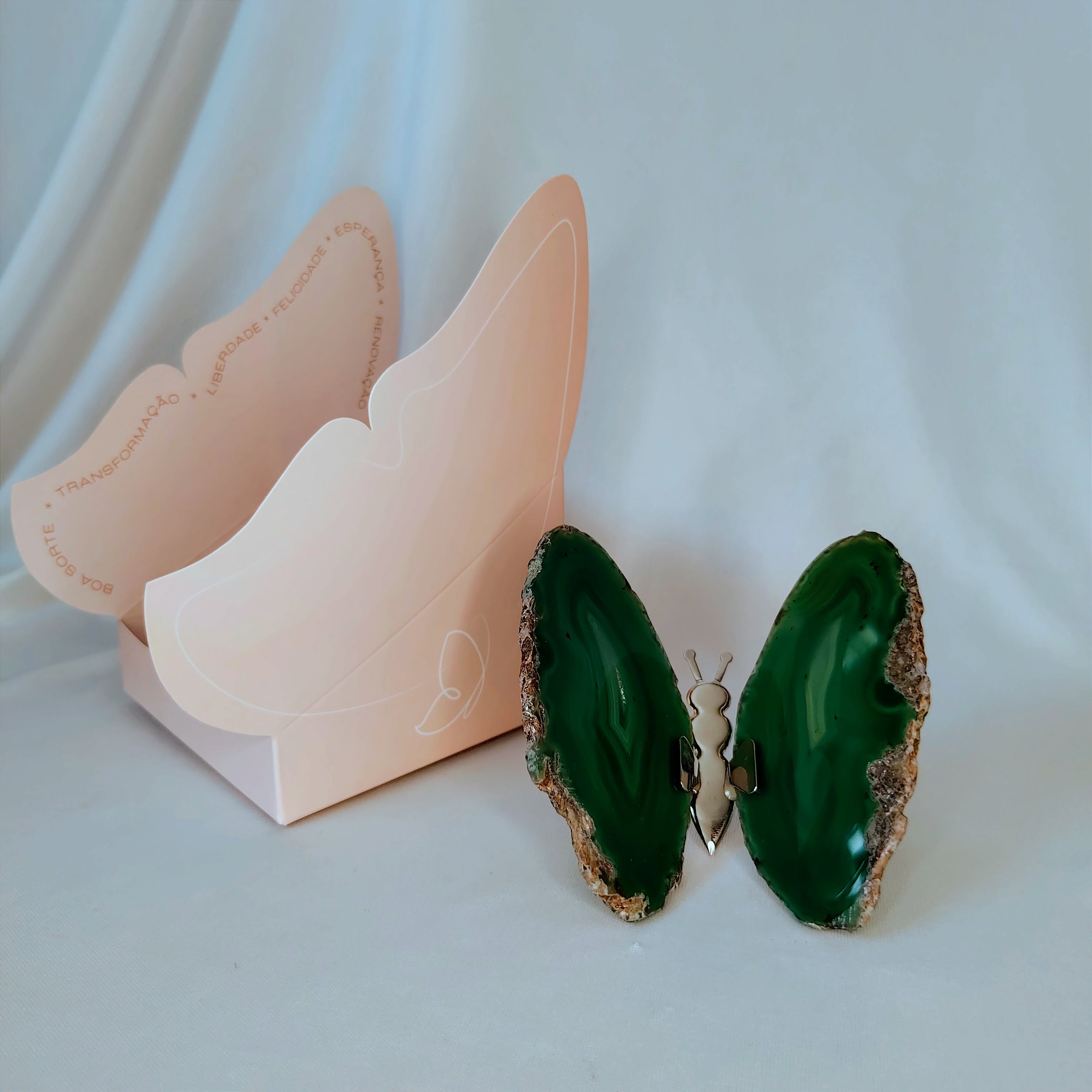 Borboleta Ágata Verde – Prata – cristal decorativo da Coleção Asas. Esta peça em ágata verde com acabamento em prata traz um equilíbrio estético entre a profundidade de suas tonalidades naturais e o brilho sutil do metal, resultando em um objeto decorativo que valoriza qualquer ambiente. A ágata é uma variedade de quartzo conhecida por sua durabilidade e padrão único de faixas, ideal para coleções ou como peça de destaque em prateleiras e aparadores. A lapidação e o polimento realçam as nuances da pedra, proporcionando um acabamento artístico e refinado.