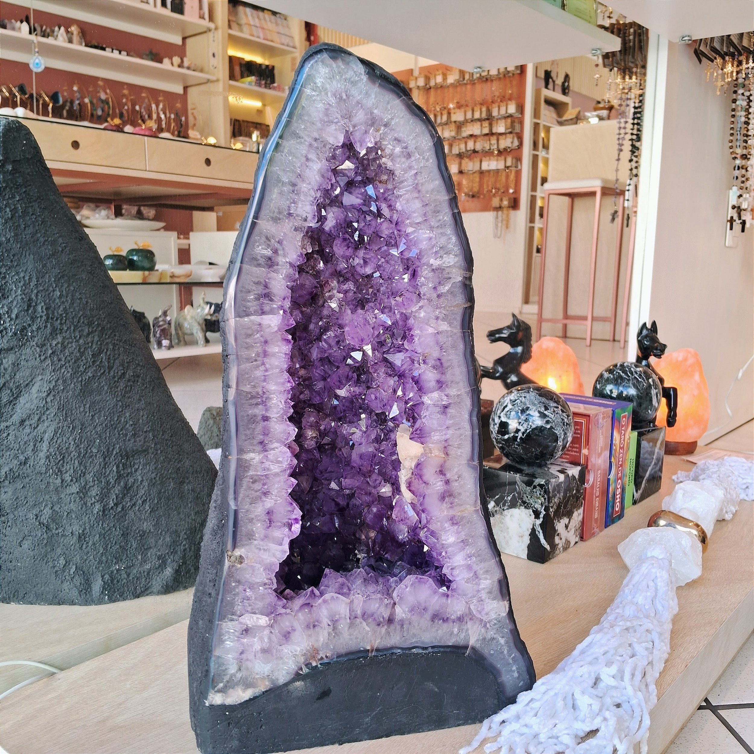 Ametista - é um cristal extremamente poderoso e protetor. É o cristal da elevação espiritual e é excelente para favorecer a meditação. Sendo um calmante natural, essa pedra preciosa facilita a tomada de decisões e promove o centramento emocional. Do ponto de vista mental, ela ajuda a nos sentirmos menos dispersos, mais focados e no controle das nossas faculdades mentais, favorecendo a assimilação de novas ideias. Dissipa raiva, medo, ódio e ansiedade.