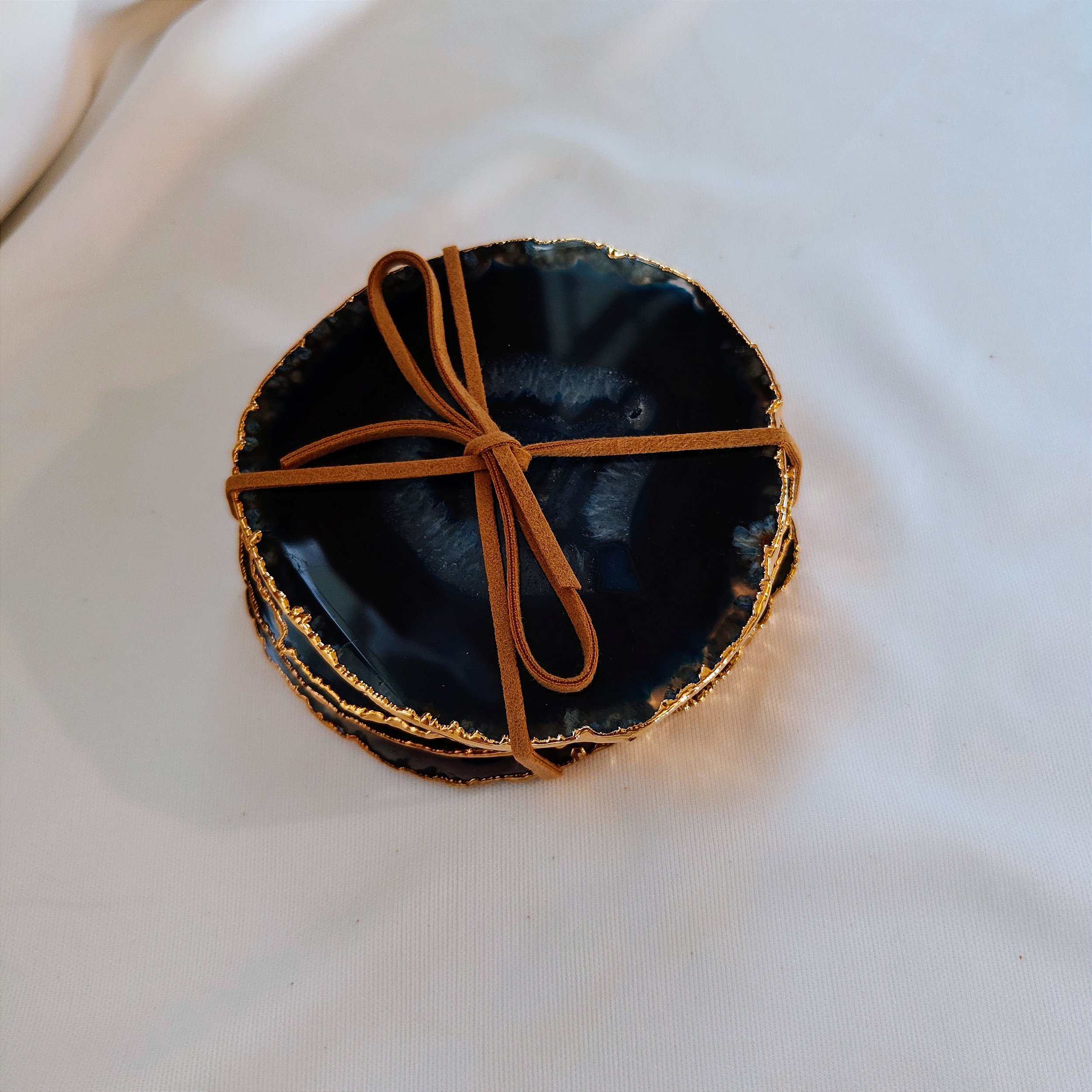 obs: Por se tratar de um produto feito com pedra natural e acabamento artesanal com borda dourada, podem ocorrer variações de tonalidade, veios, formato e tamanho entre as peças, tornando cada conjunto único.