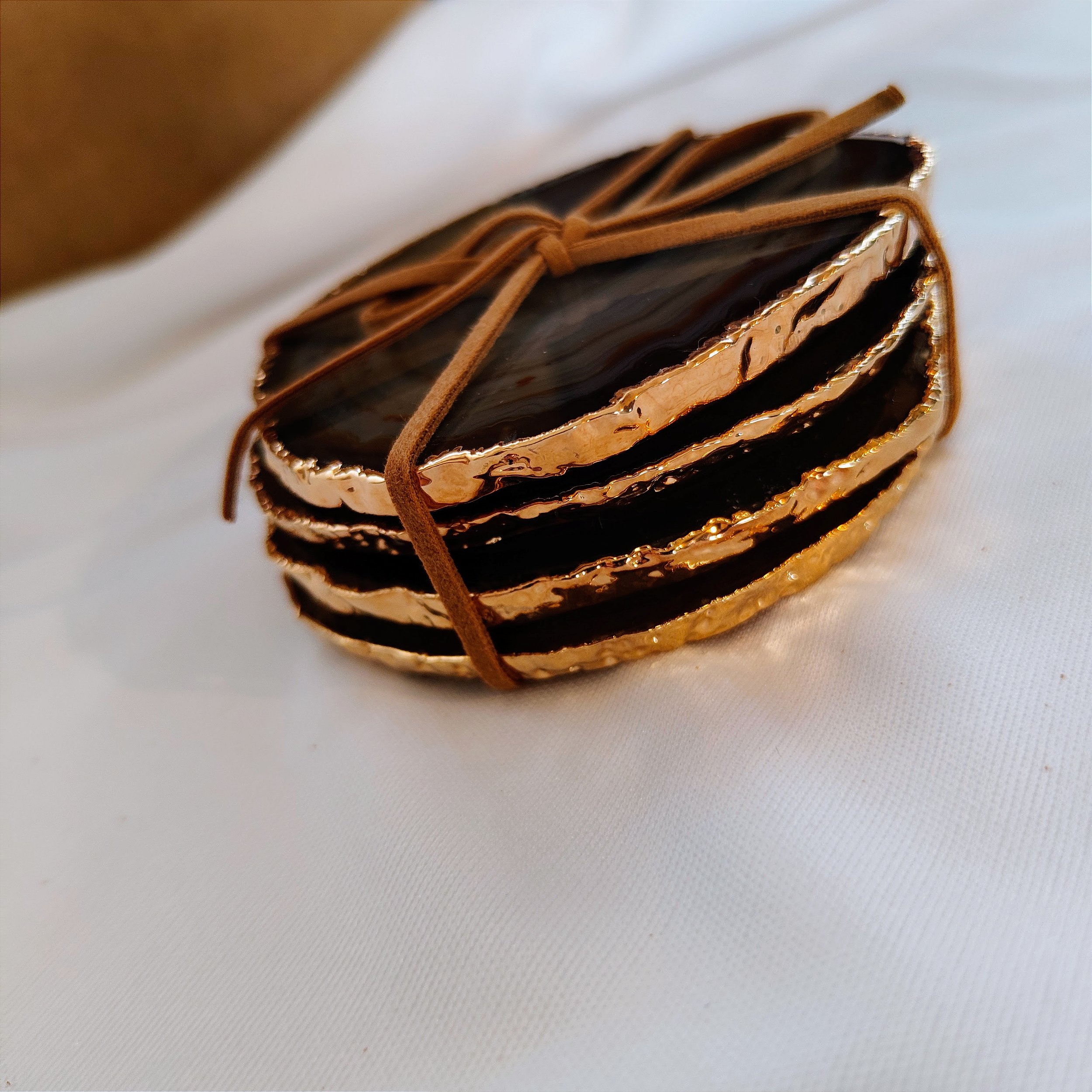 obs: Por se tratar de um produto feito com pedra natural e acabamento artesanal com borda dourada, podem ocorrer variações de tonalidade, veios, formato e tamanho entre as peças, tornando cada conjunto único.