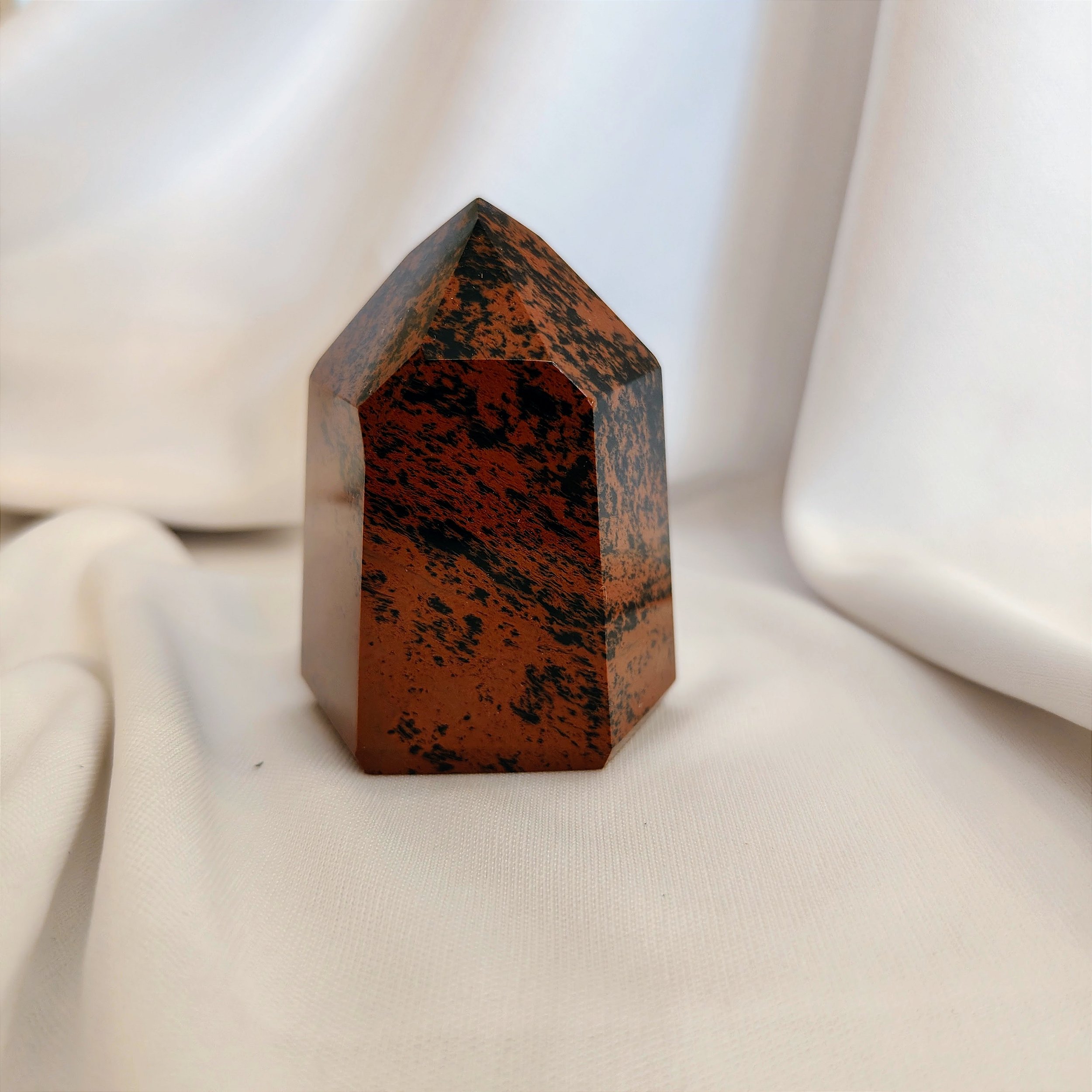 Obsdiana Mogno - energia mais suave do que obsidiana preta. Ela ancora as energias, protege, dando-nos força nos tempos de necessidades, revitaliza nosso propósito, elimina bloqueios e estimula crescimento em todos os níveis. Pedra estabilizadora que fortalece a aura. Usada em contato com corpo, a obsidiana mogno alivia a dor e melhora circulação