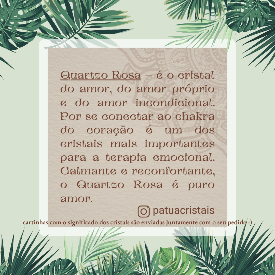 Quartzo Rosa – é a pedra do amor incondicional e da paz infinita. É o mais importante cristal para o coração. Inspira uma profunda cura interior e amor próprio. Calmante e reconfortante. Essa pedra preciosa é excelente para casos de traumas ou épocas de crise. Fortalece a empatia e a sensibilidade. É o agente de cura mais sutil.