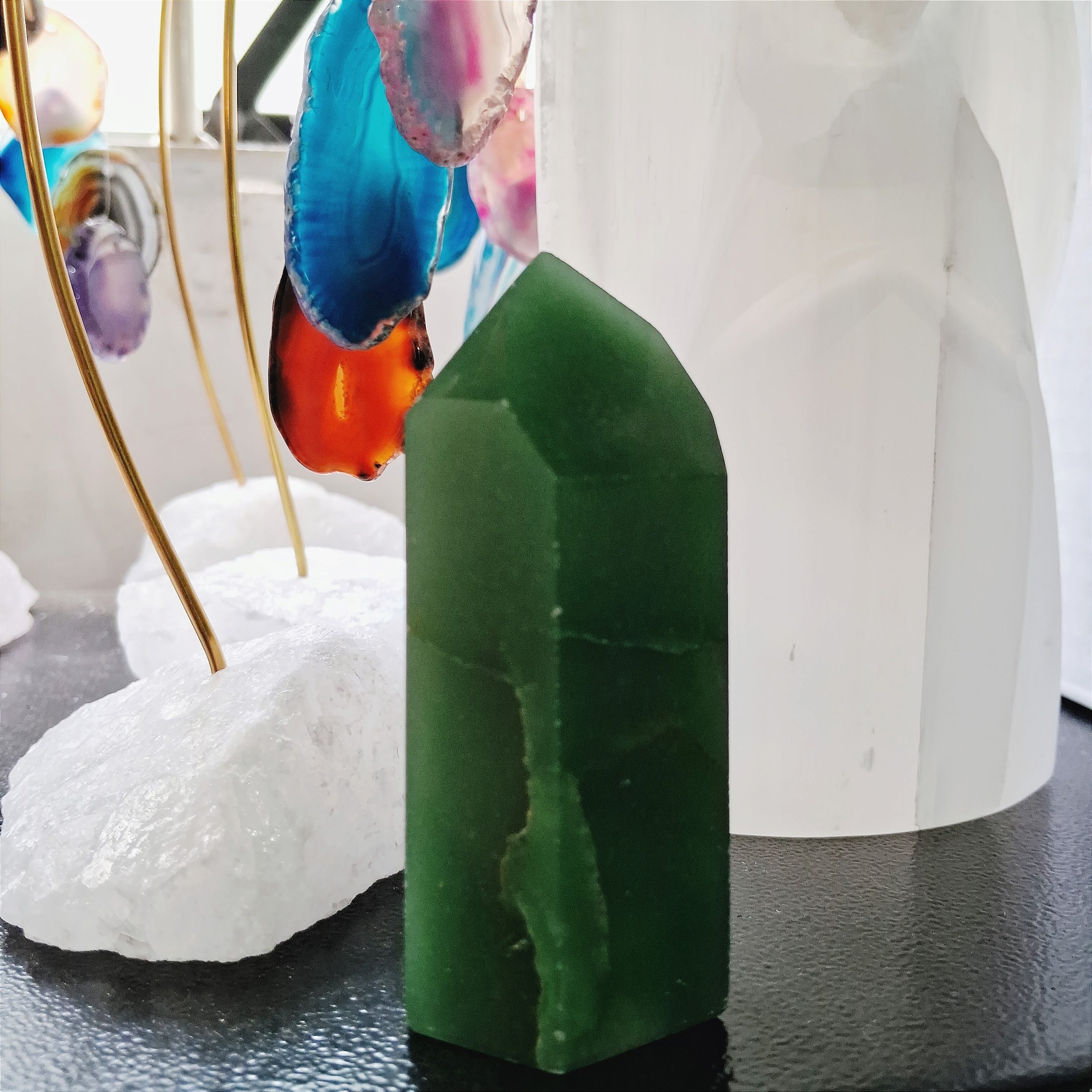 Quartzo Verde – esse cristal é um dos mais poderosos agentes de cura e amplificador de energias, é conhecido como o cristal da saúde. Ele abre e estabiliza o chakra do coração, além de o limpar e proteger, aumentando a sua capacidade de atrair o amor e aumentar a empatia. Transmuta a energia negativa inspira a criatividade, fortalece o sistema imunológico e equilibra o sistema endócrino.