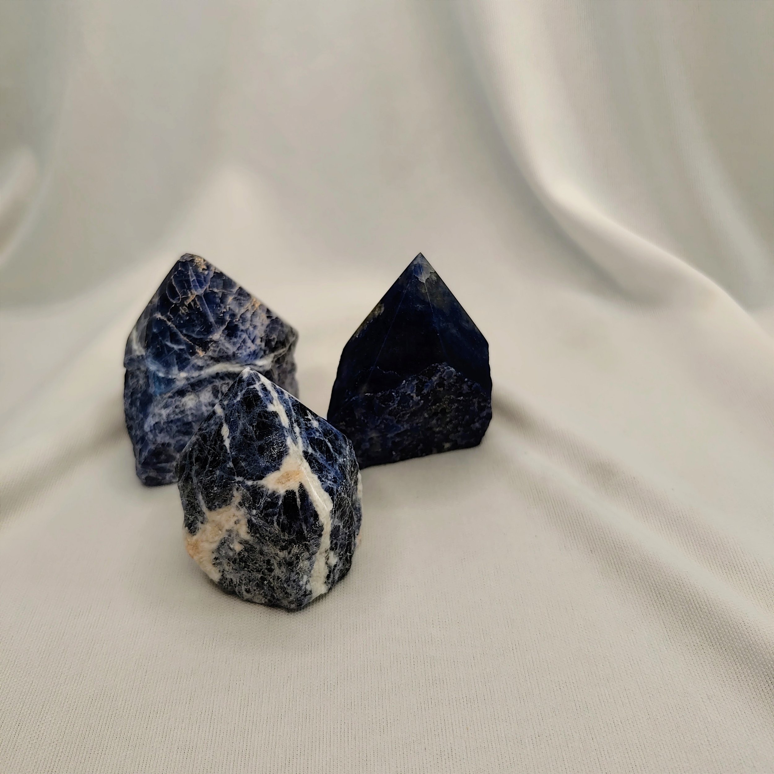 Sodalita –Traz equilíbrio emocional, reduz a ansiedade e ameniza ataques de pânico. Favorece nosso metabolismo, facilitando o emagrecimento, além de reduzir a fome por motivos emocionais. Elimina a confusão mental, estimula o pensamento racional, a objetividade, a verdade e a percepção intuitiva, além de ajudar a verbalizar os sentimentos. É indicada também para todos os males envolvendo o cérebro, inclusive as dores de cabeça, fadiga mental e insônia. Quando posta em frente ao computador bloqueia a poluição eletromagnética.