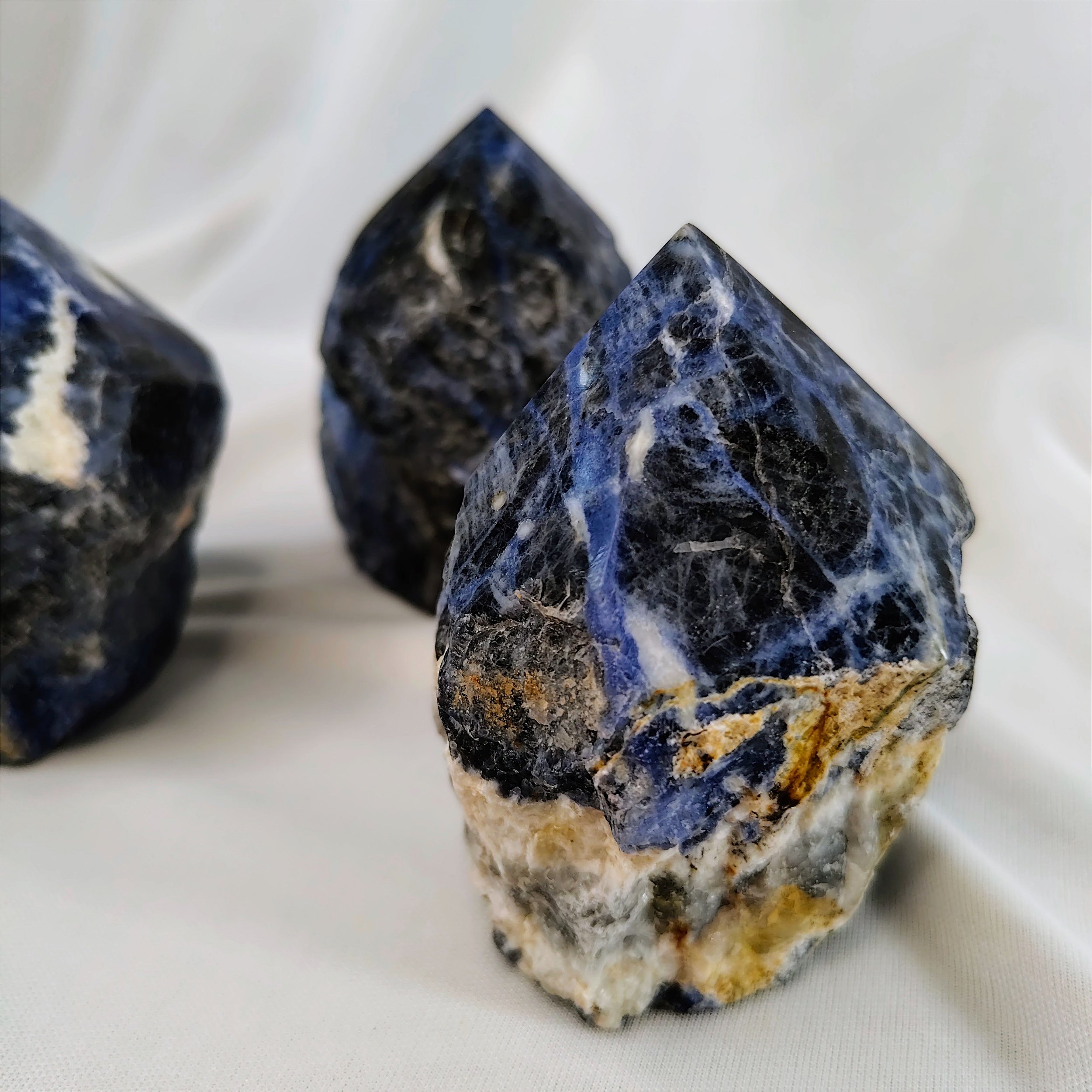 Sodalita –Traz equilíbrio emocional, reduz a ansiedade e ameniza ataques de pânico. Favorece nosso metabolismo, facilitando o emagrecimento, além de reduzir a fome por motivos emocionais. Elimina a confusão mental, estimula o pensamento racional, a objetividade, a verdade e a percepção intuitiva, além de ajudar a verbalizar os sentimentos. É indicada também para todos os males envolvendo o cérebro, inclusive as dores de cabeça, fadiga mental e insônia. Quando posta em frente ao computador bloqueia a poluição eletromagnética.