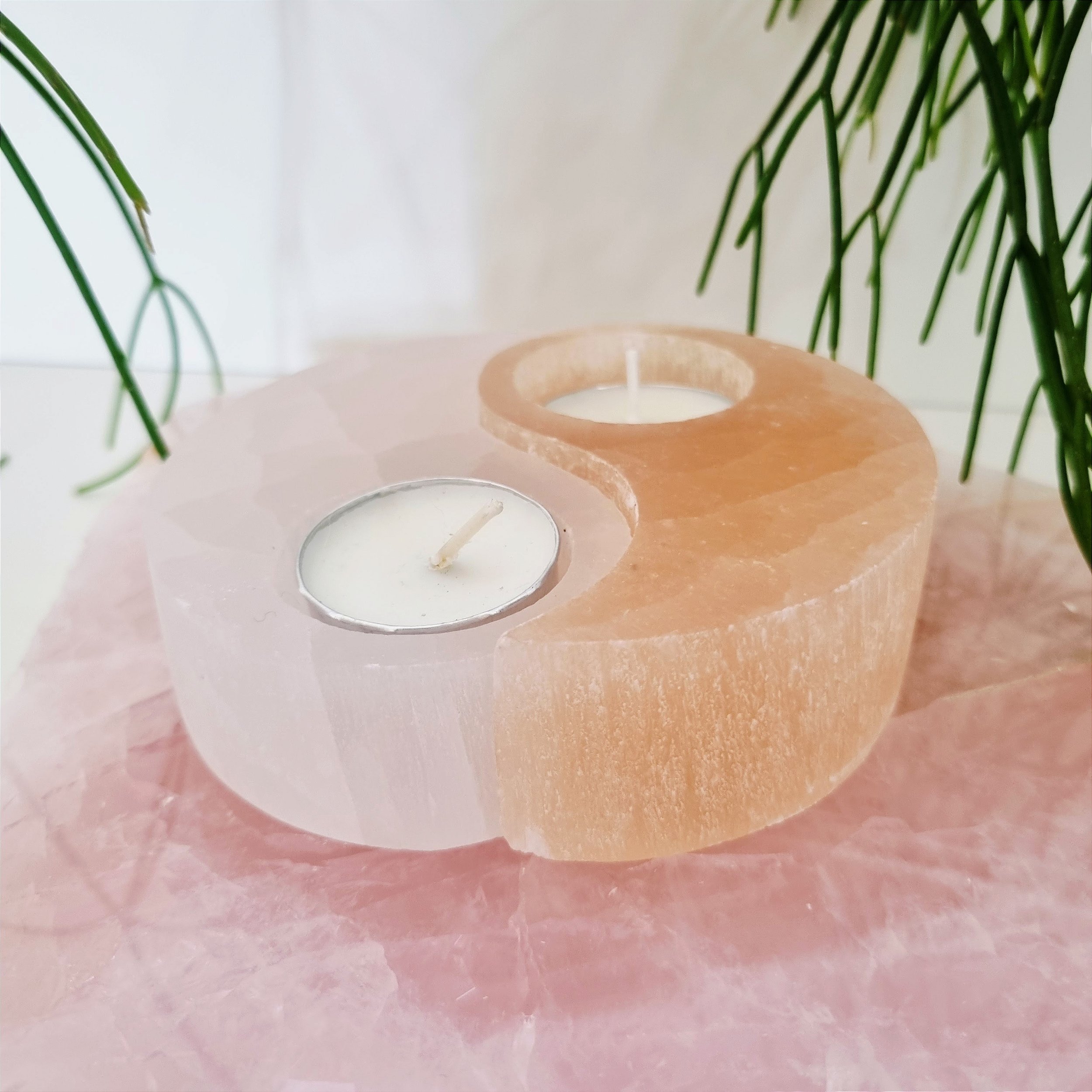 Porta Vela Yin Yang Selenita Branca e Selenita Laranja