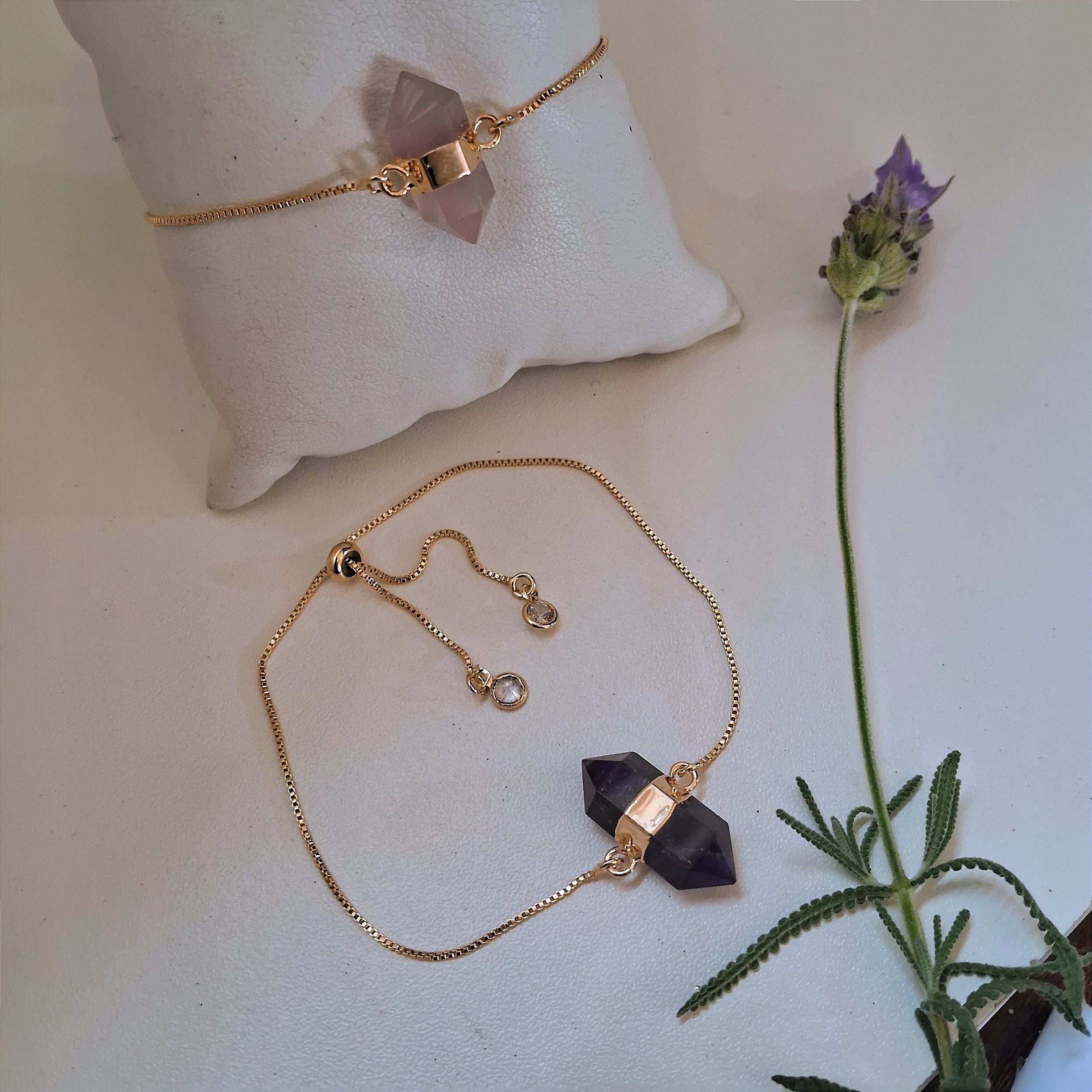 Ametista - é um cristal extremamente poderoso e protetor. É o cristal da elevação espiritual e é excelente para favorecer a meditação. Sendo um calmante natural, essa pedra preciosa facilita a tomada de decisões e promove o centramento emocional. Do ponto de vista mental, ela ajuda a nos sentirmos menos dispersos, mais focados e no controle das nossas faculdades mentais, favorecendo a assimilação de novas ideias. Dissipa raiva, medo, ódio e ansiedade.